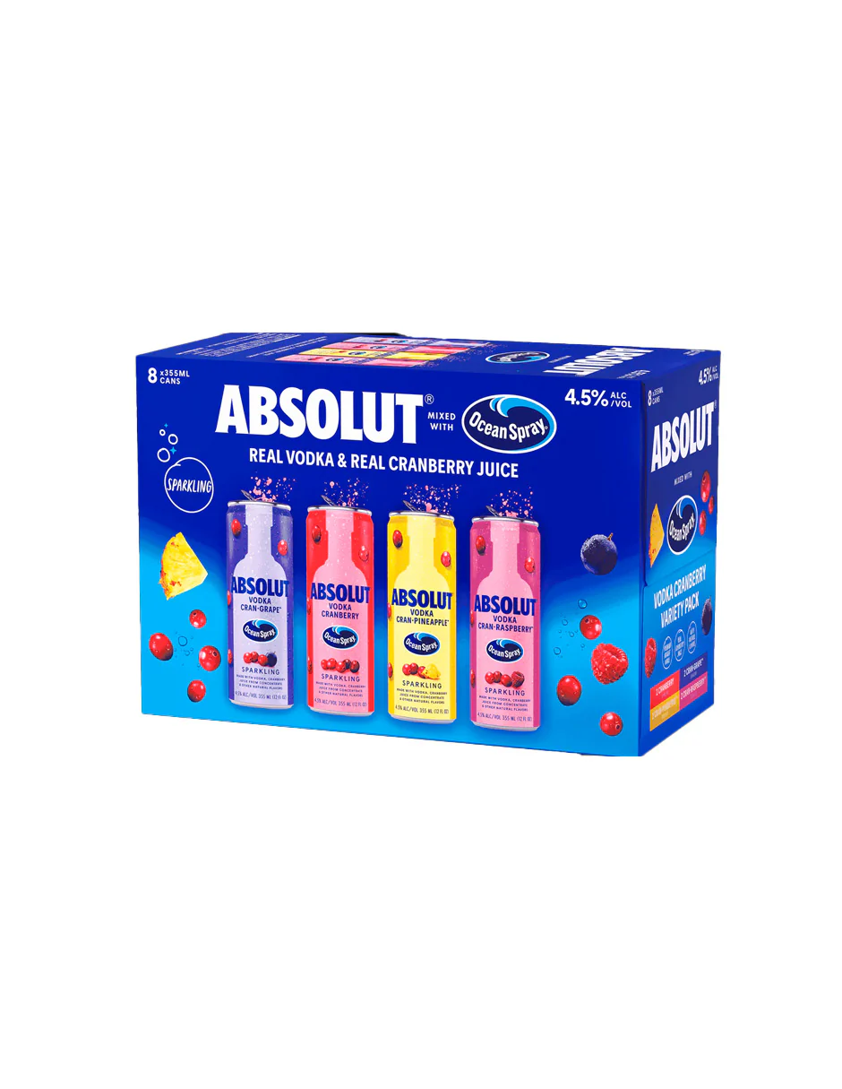 La combinación clásica de Absolut Vodka y zumo de arándano Ocean Spray® en un práctico formato listo para beber. Mezclado por expertos y disponible en cuatro sabores espumosos. Vodka de verdad. Jugo de verdad. Muy delicioso.