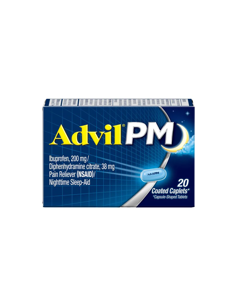 Advil PM ofrece una combinación eficaz de ibuprofeno (200 mg) y difenhidramina (38 mg) por tableta recubierta, diseñada para aliviar el insomnio ocasional asociado con dolores menores como dolor de espalda, muscular o articular.