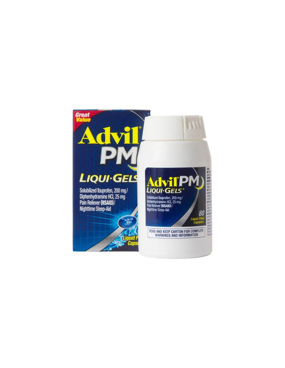 - Una botella de 80 cápsulas llenas de líquido de Advil PM Liqui-Gels analgésico y ayuda para dormir durante la noche, ibuprofeno para aliviar el dolor