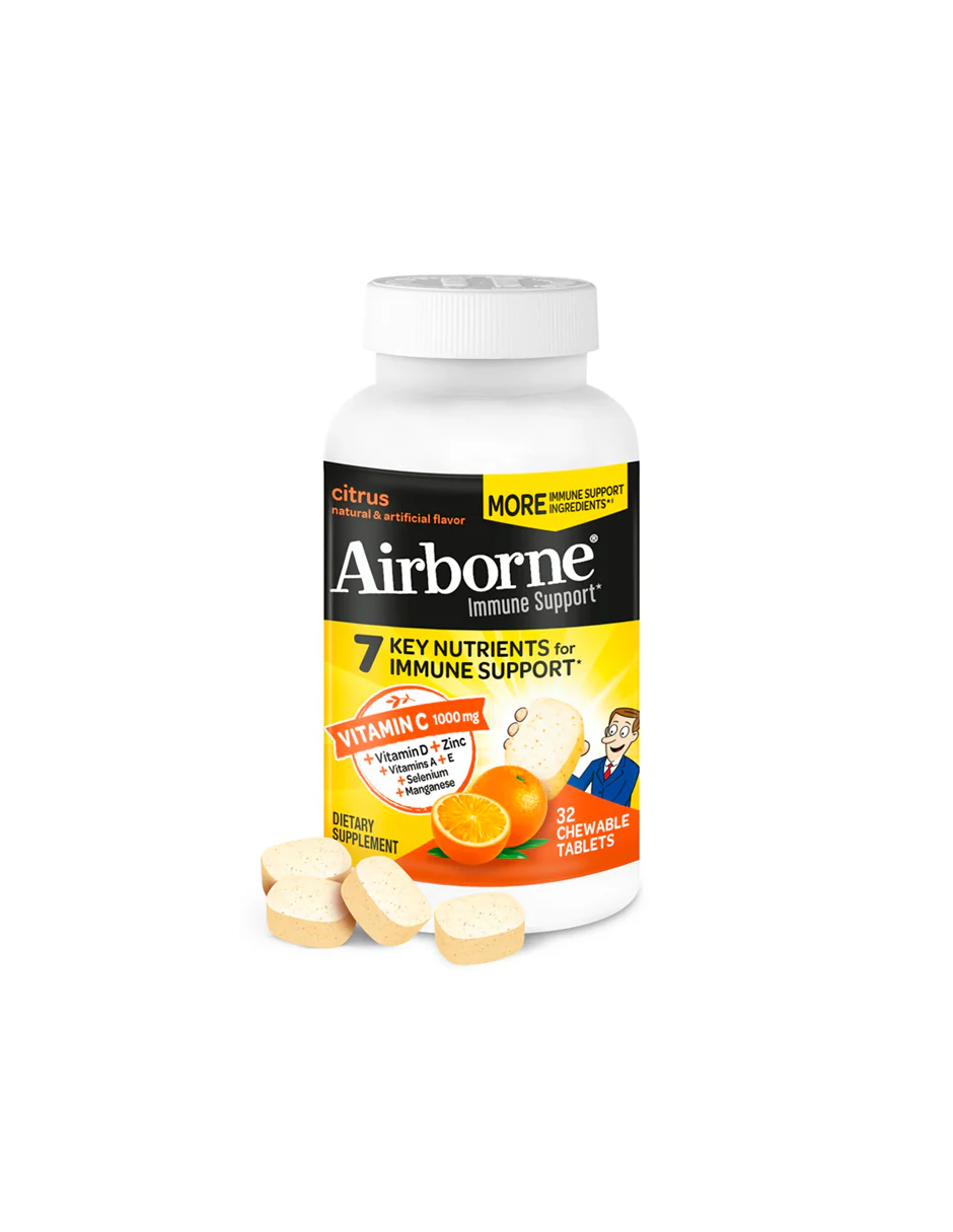 - VITAMINA C 1000mg: Las tabletas de zinc masticables Airborne Vitamina C están llenas de 1000 mg de vitamina C por porción, lo que ayuda a apoyar su sistema inmunológico.