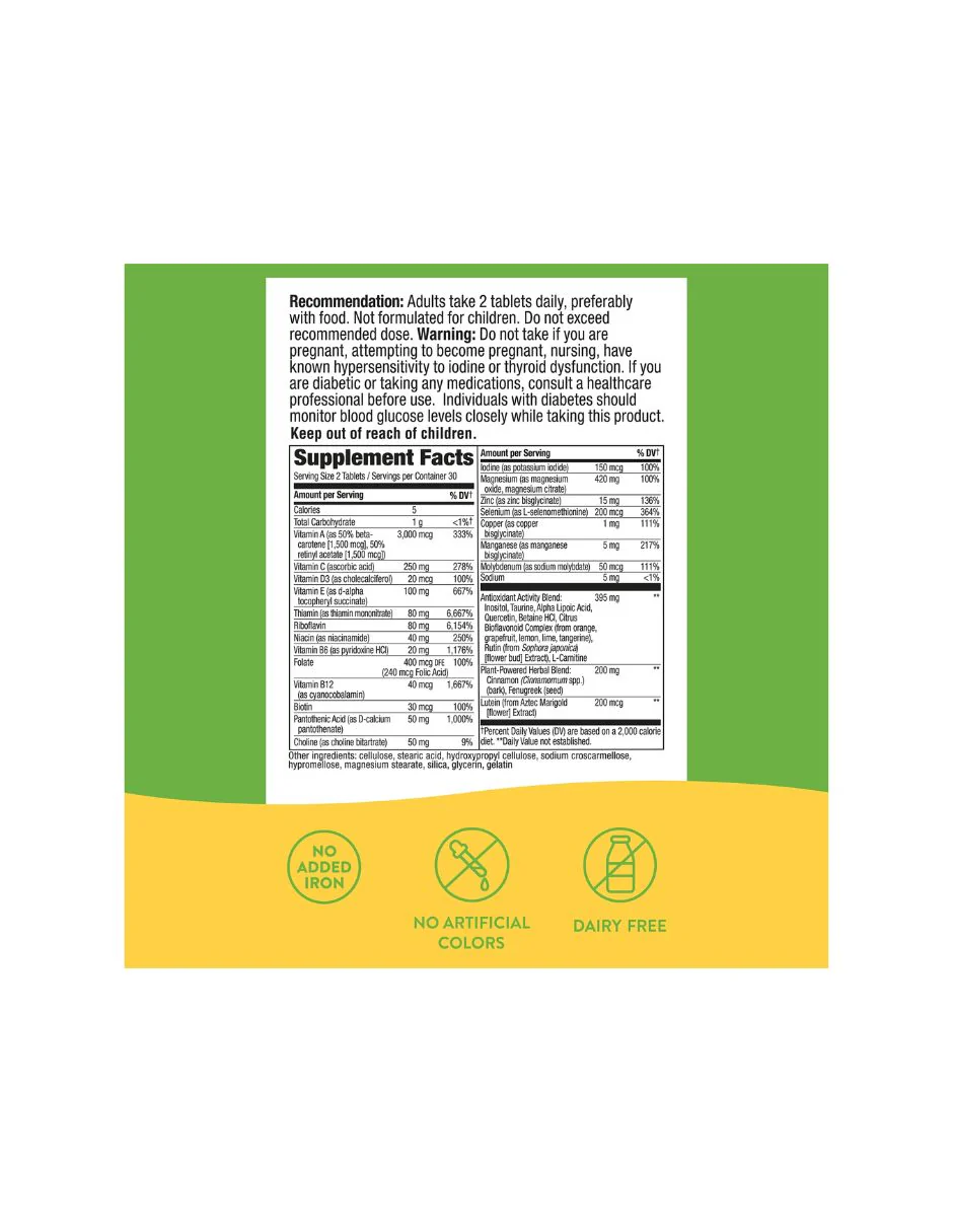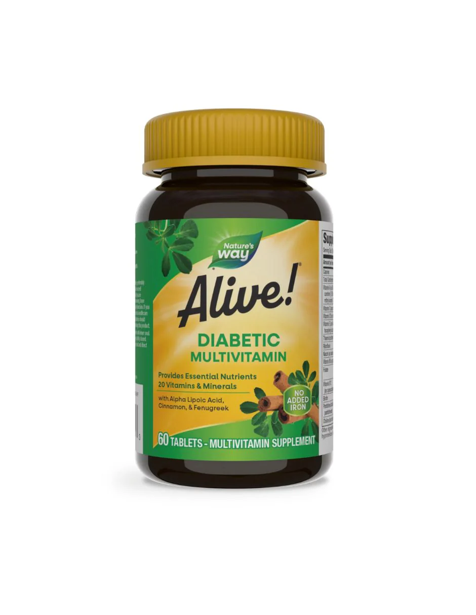 Nature’s Way Alive! Diabetic Multivitamin es un multivitamínico diario especialmente formulado para adultos con diabetes. Contiene 19 vitaminas y minerales esenciales al 100% o más del valor diario, incluyendo vitaminas B de alta potencia, antioxidantes y extractos botánicos que apoyan el metabolismo y el bienestar general.