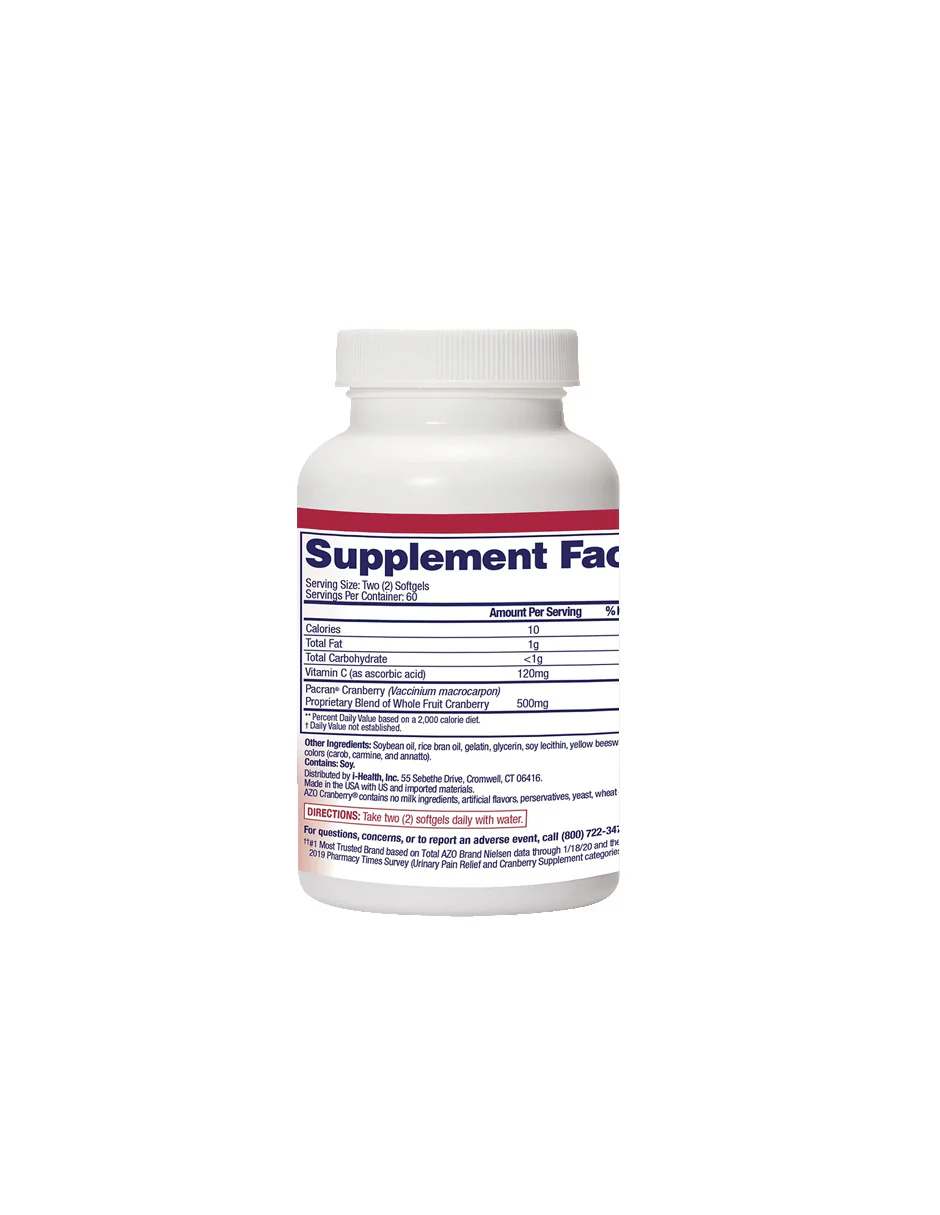 Las cápsulas blandas AZO Cranberry ofrecen los beneficios de un vaso de jugo de arándano, sin azúcares añadidos ni calorías extras. Formuladas con Pacran®, un polvo de arándano súper concentrado clínicamente probado, ayudan a mantener un tracto urinario saludable de forma práctica y sin gluten.