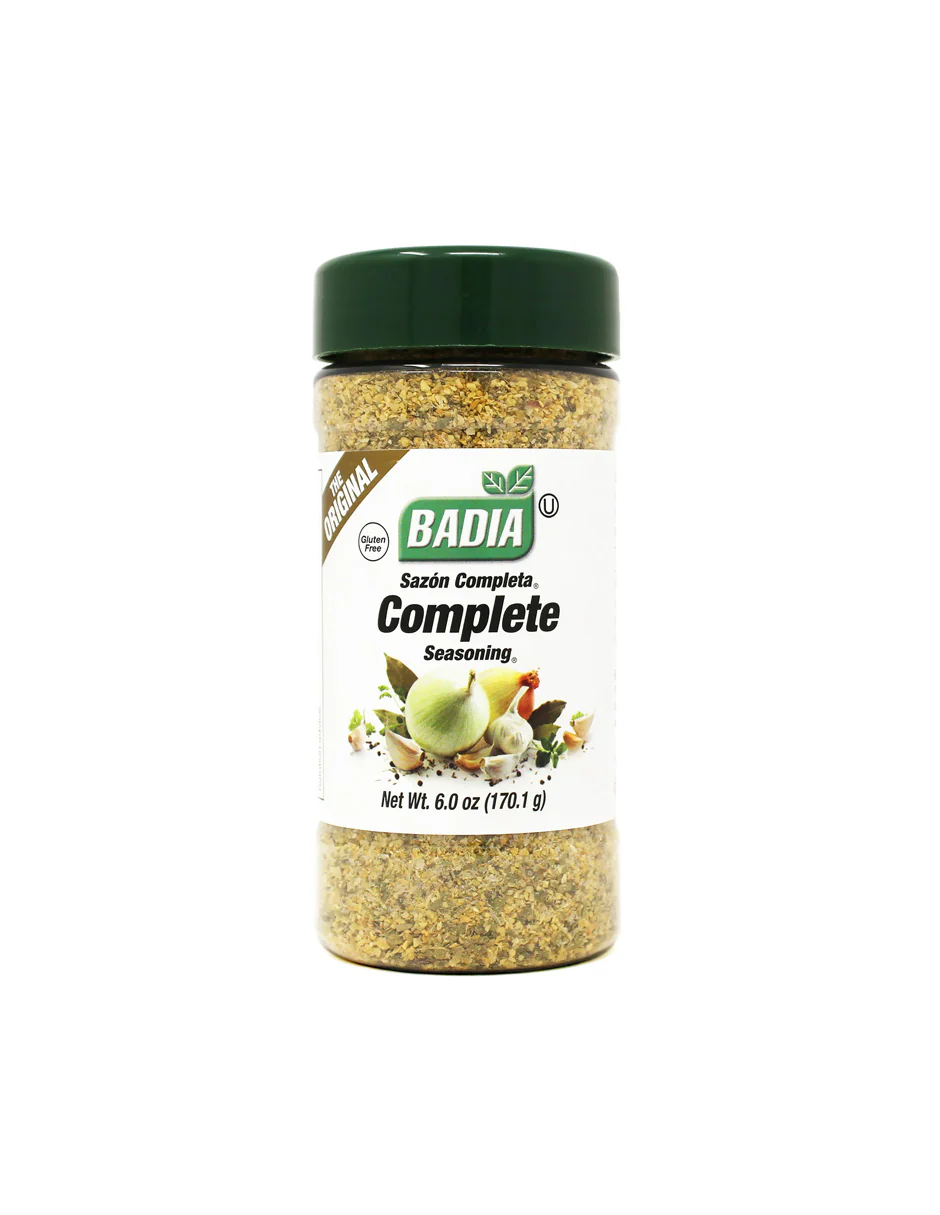 Badia the Original Complete Seasoning agrega un sabor único a sus alimentos. Contiene una mezcla de cebolla y ajo con especias especialmente seleccionadas para realzar el sabor natural de sus platos favoritos. El sabor es similar al que se encuentra en muchos platos latinos. Espolvoréelo sobre carnes, aves y pescados, así como sobre verduras al gusto. También es ideal para preparar sopas, guisos y salsas. Mantenga varios de estos envases de 6 oz de condimentos sin gluten en la despensa de su cocina para las comidas diarias. Este producto es una opción adecuada para las personas que siguen una dieta kosher. Explore otras especias de Badia, como curry en polvo, pimienta negra molida, pimienta de limón, azafrán español, orégano, comino, albahaca y más (cada uno se vende por separado).