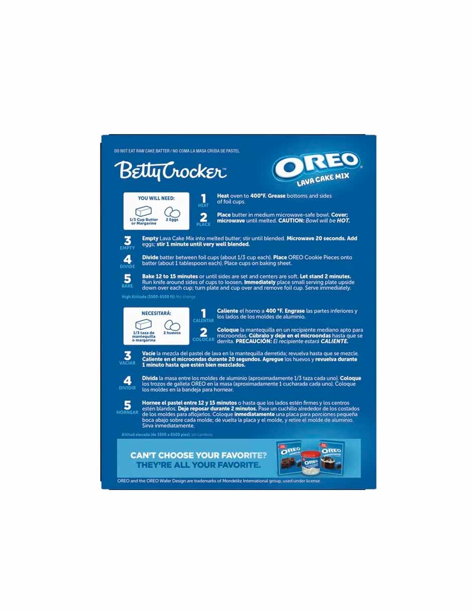 Descubre el placer de un centro fundido de chocolate con trozos reales de galleta Oreo en cada bocado. La mezcla para pastel de lava Oreo de Betty Crocker te permite preparar fácilmente 4 pasteles individuales con una textura húmeda y un corazón de chocolate derretido. Solo necesitas mantequilla y huevos para crear un postre caliente, suave y sorprendente que encantará a todos. Ideal para cenas especiales, celebraciones o darte un gusto cualquier día. Rápido de preparar, inolvidable al probar. Llévalo a casa y disfruta del sabor Oreo con el toque casero de Betty Crocker.