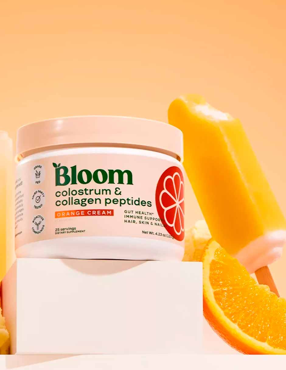 Bloom Nutrition Mezcla de calostro bovino con péptidos de colágeno sabor naranja con crema 120g