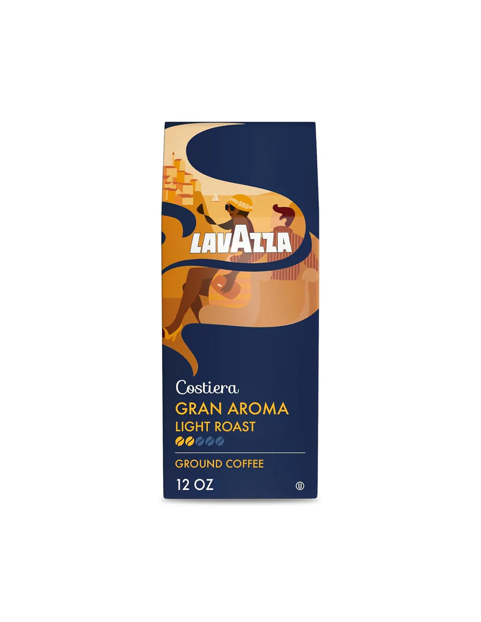 Café molido Lavazza Gran Aroma de 340 g, con mezcla 100 % arábica, tostado medio. Ofrece un perfil equilibrado con aroma floral y notas de cítricos y chocolate. Elaborado y tostado en Italia, sin ingredientes modificados genéticamente. Ideal para preparar en cafetera de goteo o prensa francesa.