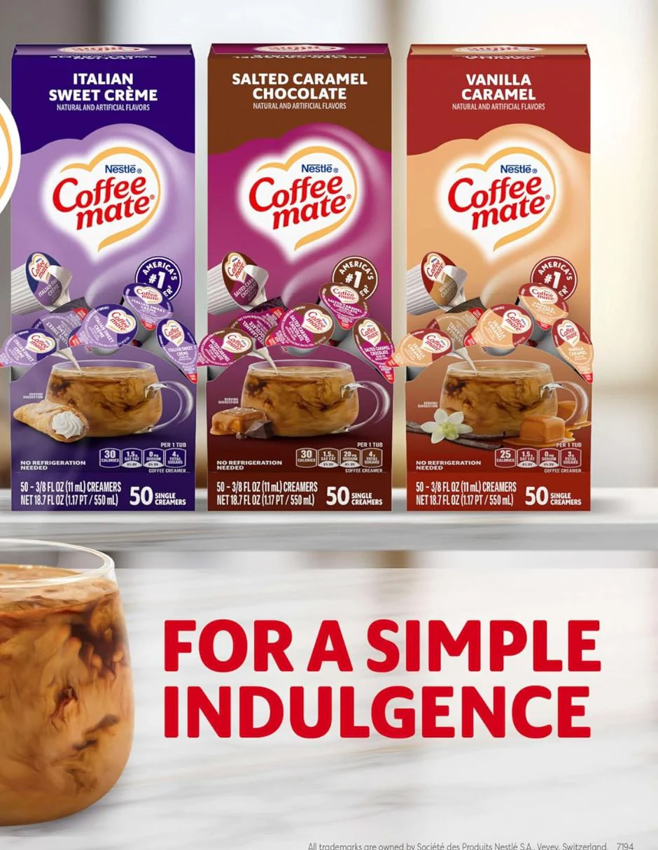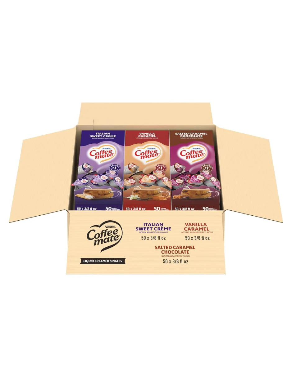 El paquete variado de cremas individuales Nestlé Coffee Mate incluye 150 envases de 0.375 fl oz, con una selección surtida de crema dulce italiana, chocolate con caramelo salado y caramelo de vainilla sin lácteos. Estas cremas líquidas se mezclan fácilmente con bebidas calientes o frías y no requieren refrigeración, lo que las hace prácticas para oficina, eventos o consumo diario. Son libres de gluten, sin colesterol y aptas para dietas kosher. Diseñadas para conservar su calidad a temperatura ambiente durante almacenamiento prolongado.