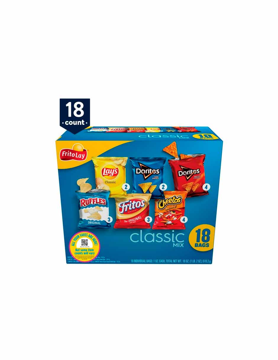 El Frito-Lay Classic Variety Pack (18 unidades) reúne las botanas favoritas de generaciones en presentaciones individuales. Práctico, delicioso y listo para acompañarte en cada momento del día.