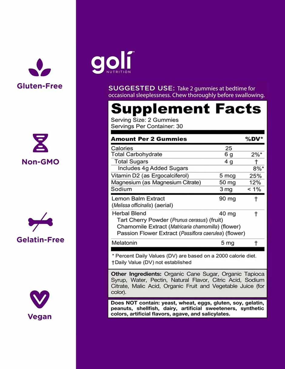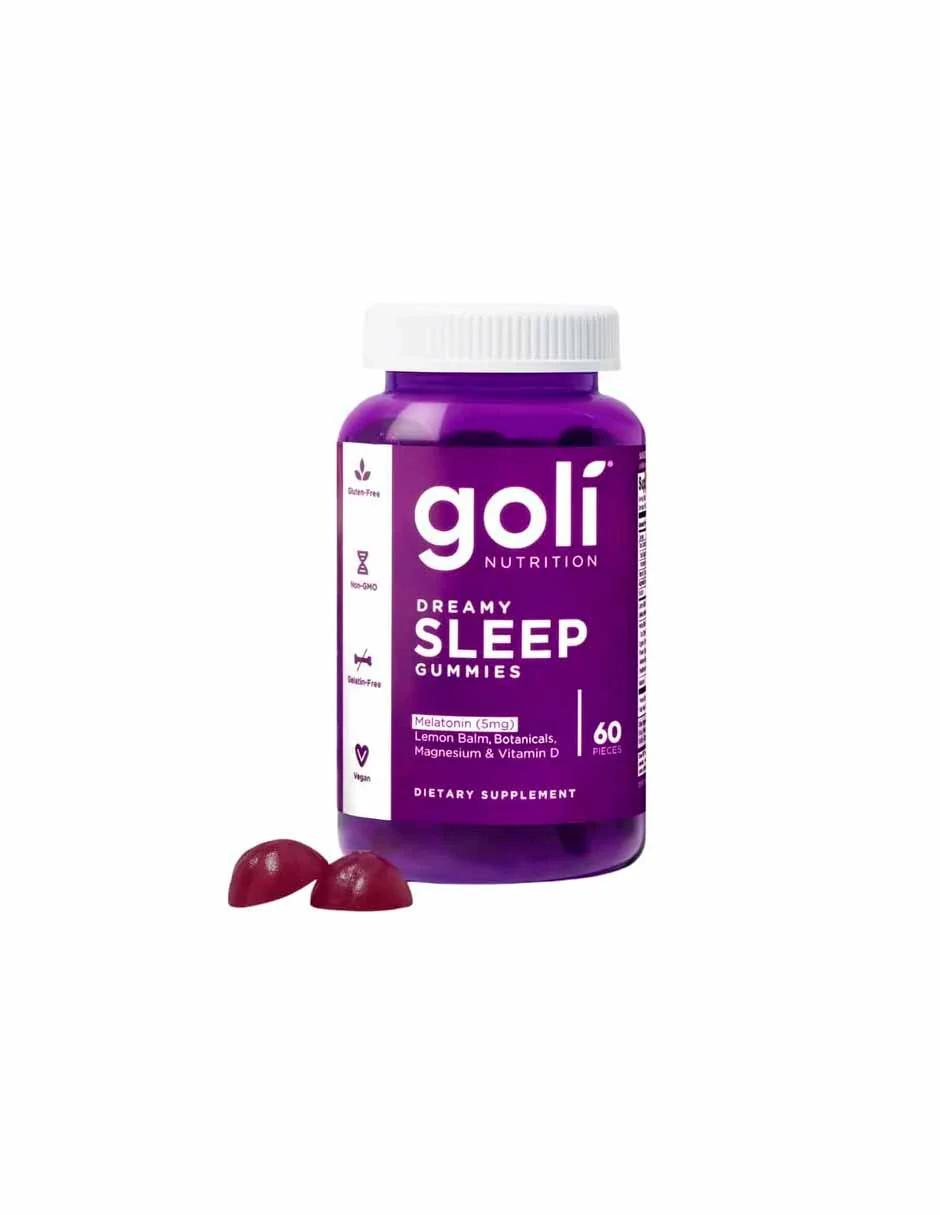 Sin OGM, vegano, sin gluten y sin gelatina: cada botella de Goli® Dreamy Sleep Gummies contiene 60 deliciosas gomitas sin OGM, veganas, sin gluten y sin gelatina.