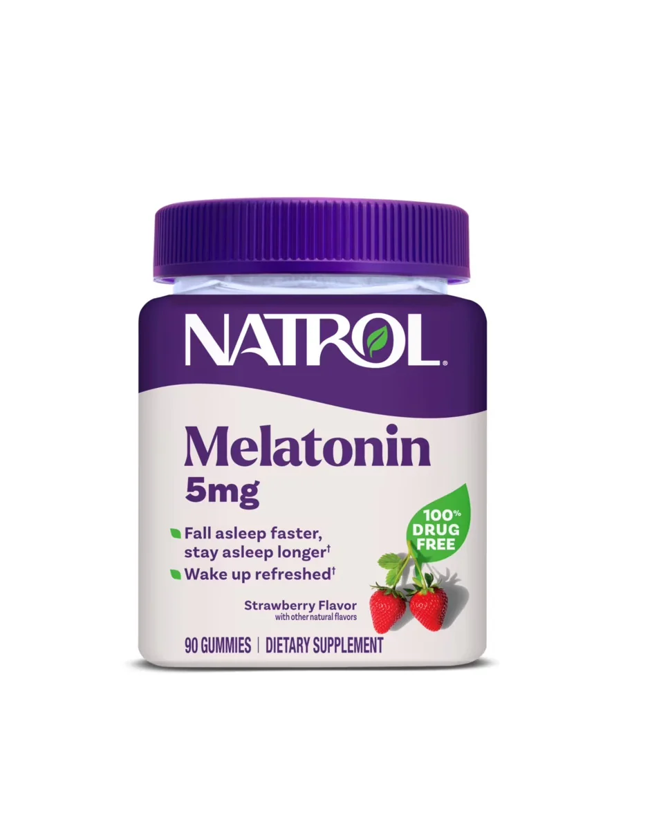 Natrol® Melatonin ofrece apoyo natural para el descanso con gomitas de 5 mg sabor fresa. Su fórmula a base de pectina vegetal es más fácil de masticar y no contiene gelatina, OGM ni colorantes artificiales. Cada frasco incluye 90 gomitas, ideal para un uso de hasta 45 noches. Toma una gomita 30 minutos antes de dormir y mejora tu rutina nocturna.
