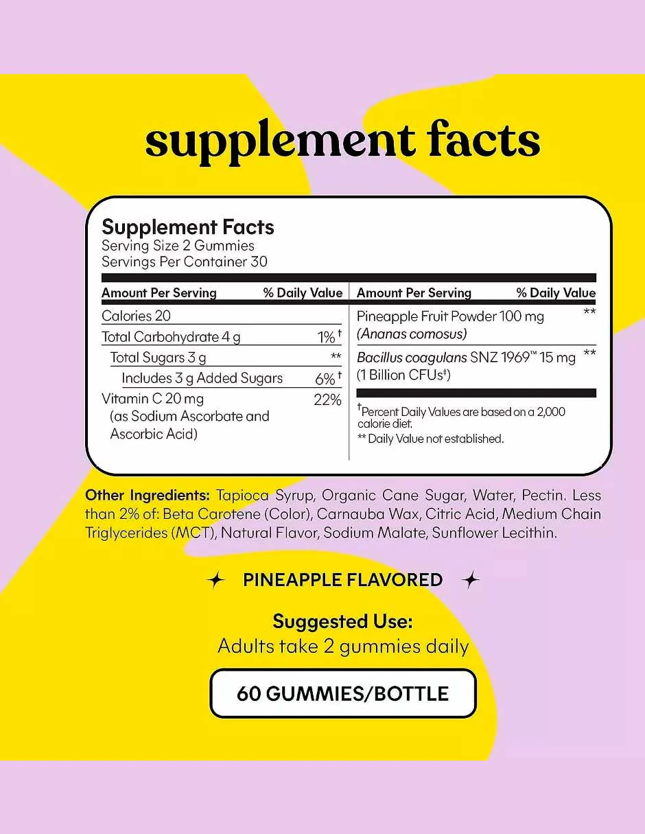 Las gomitas probióticas vaginales Lemme Purr están formuladas con probióticos SNZ-1969 clínicamente estudiados que respaldan la salud vaginal, los niveles de pH, la frescura y el olor. Además, agregamos vitamina C para respaldo antioxidante y extracto de piña real.