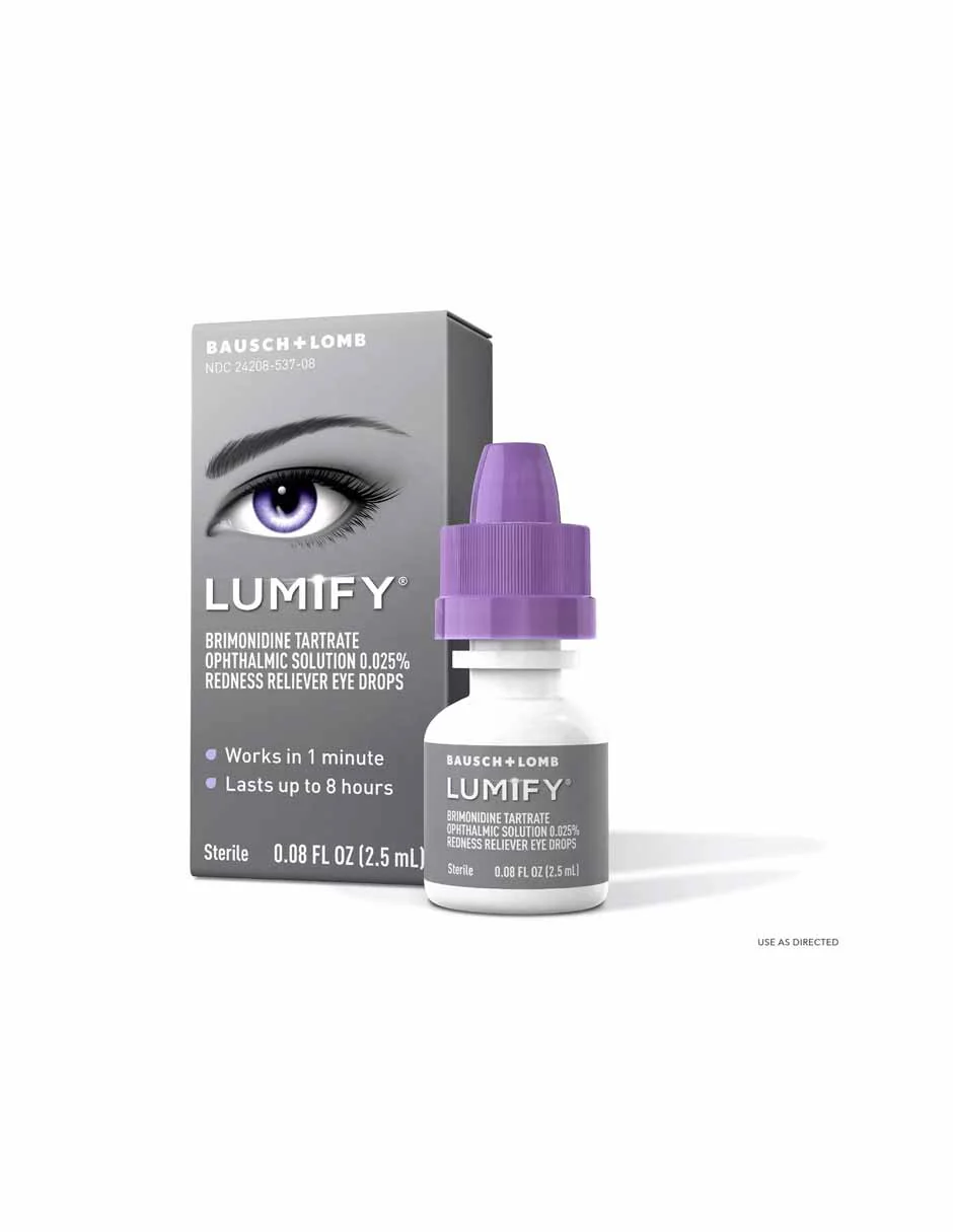 Logra una mirada más fresca y luminosa con las gotas para ojos LUMIFY. Su fórmula única con brimonidina ayuda a reducir el enrojecimiento desde el primer minuto y ofrece resultados que duran hasta 8 horas. No contiene lejía ni colorantes, y ha sido clínicamente probada para un uso seguro cuando se sigue según indicaciones. Presentación de 2.5 ml, ideal para llevar contigo y usar cuando lo necesites.