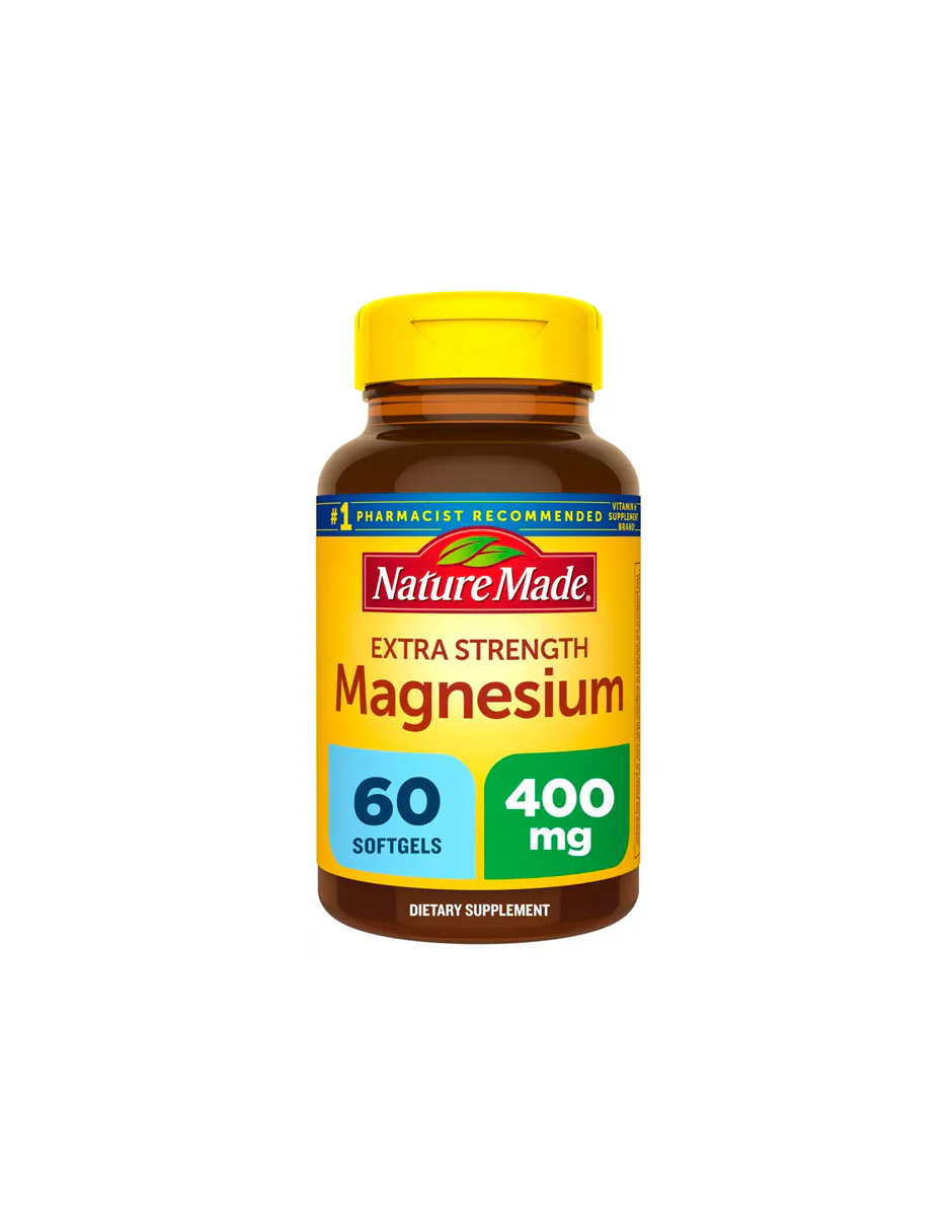 Suplemento para el apoyo de los nervios, los huesos y el corazón: contiene una botella de 60 cápsulas blandas de magnesio de 400 mg de Nature Made Extra Strength para un suministro de 60 días