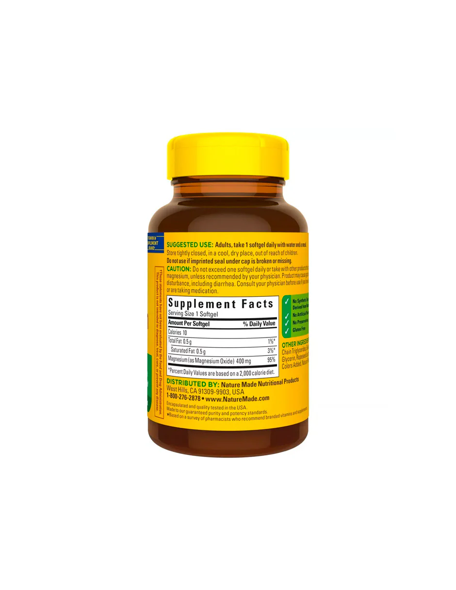 Los adultos toman una de estas cápsulas blandas de magnesio Nature Made de 400 mg diariamente con agua y una comida.