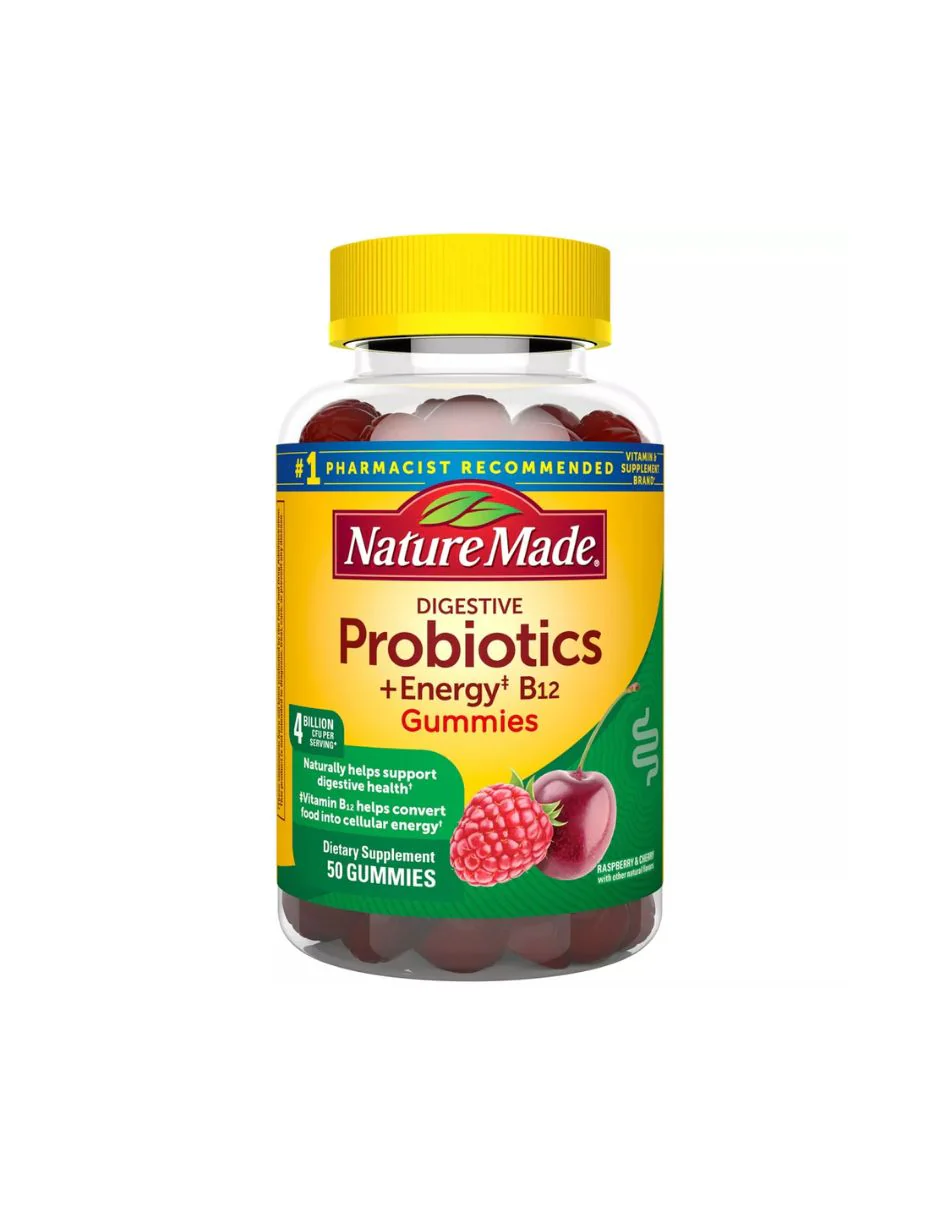 Las gomitas de probióticos para hombres y mujeres con vitamina B12 tienen deliciosas frambuesa y cereza con otros sabores naturales; Adultos, masticar dos gomitas al día.