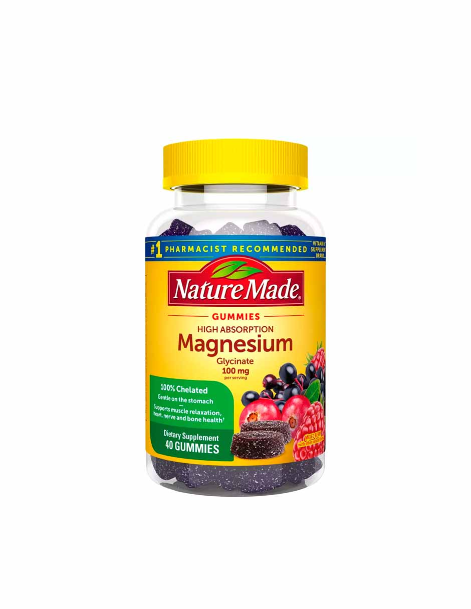 Contiene una botella de 40 unidades de glicinato de magnesio de alta absorción Nature Made de 100 mg por porción de gomitas para un suministro de 20 días