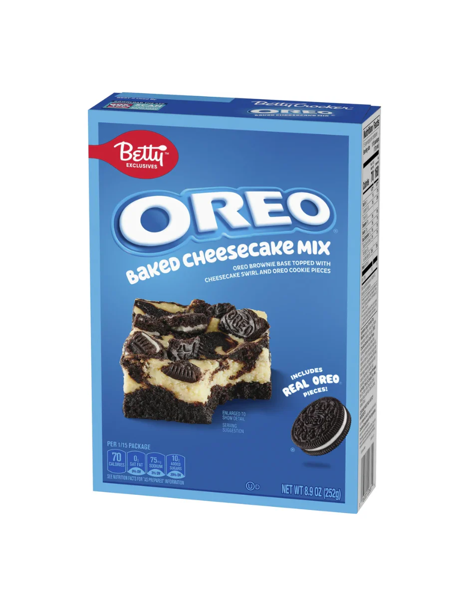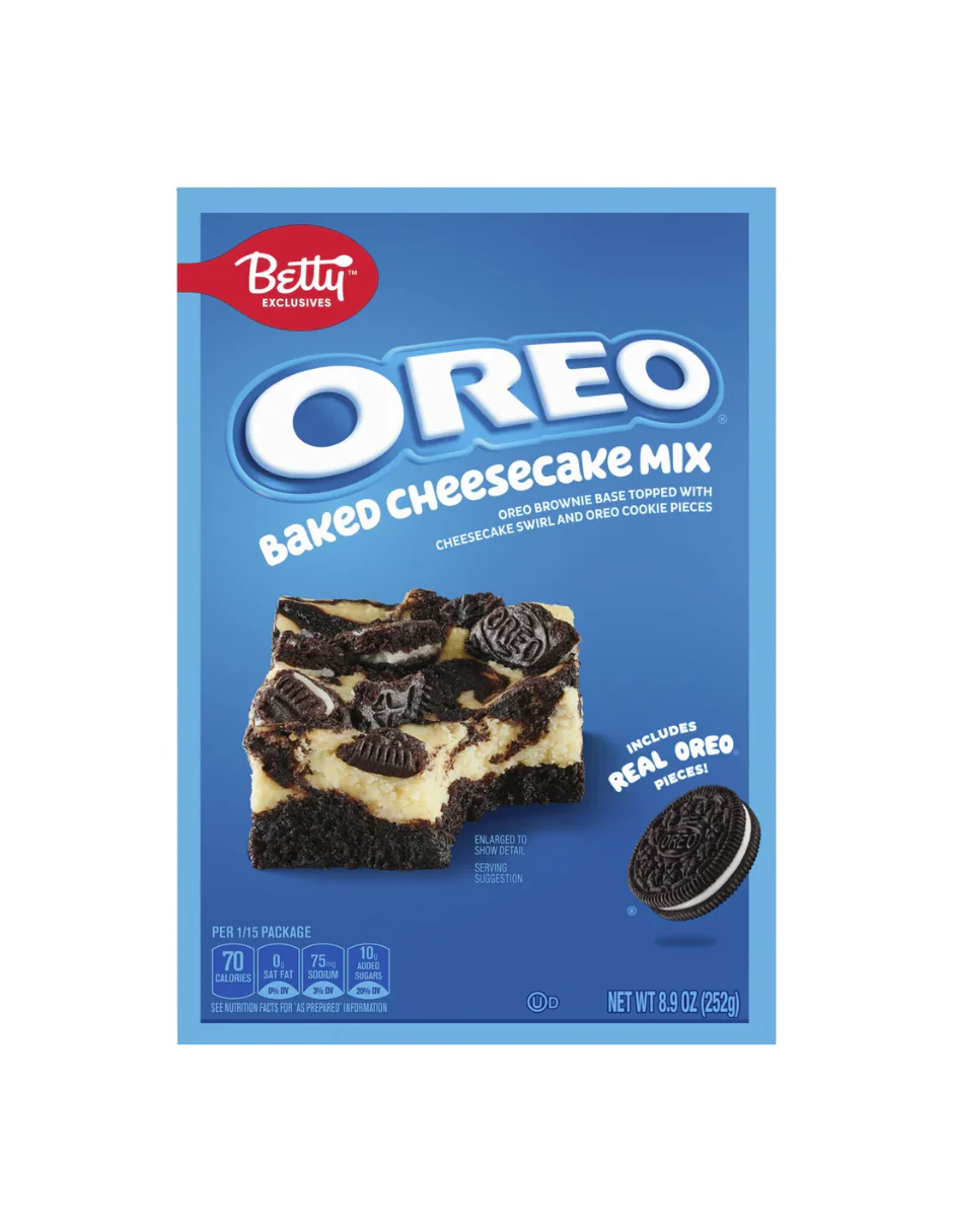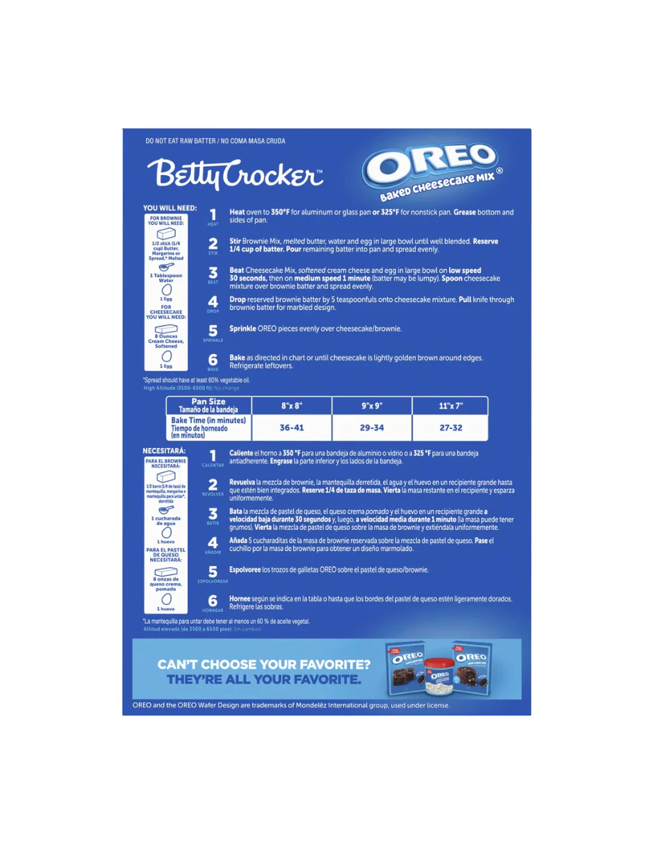Sorprende con un postre irresistible combinando lo mejor de dos mundos: brownie y cheesecake con galleta Oreo. La mezcla Betty Crocker Oreo Baked Cheesecake incluye piezas reales de galleta Oreo, una base de brownie suave y un remolino cremoso de cheesecake, ideal para crear un postre espectacular en casa. Solo agrega mantequilla, huevos, agua y queso crema para disfrutar de 15 porciones perfectas para fiestas, reuniones o antojos cotidianos. Calidad y sabor respaldados por Betty Crocker, directo a tu despensa.