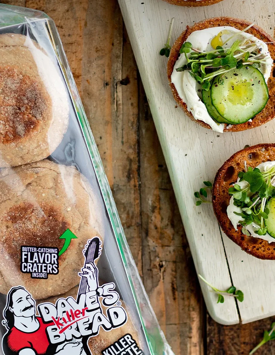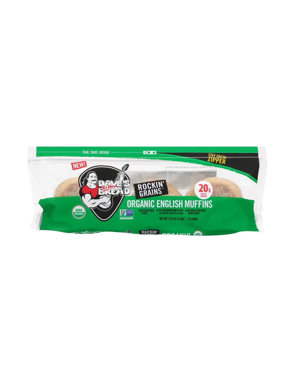 Empieza tu mañana con energía y sabor con los panecillos ingleses Dave’s Killer Bread® Rockin’ Grains®. Elaborados con granos enteros y supersemillas como lino, girasol, sésamo, mijo y quinoa, ofrecen 20 g de granos enteros por porción. Sin OGM, sin conservadores ni ingredientes artificiales, y sin jarabe de maíz de alta fructosa. Certificados orgánicos por el USDA.