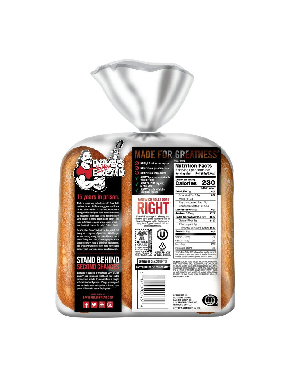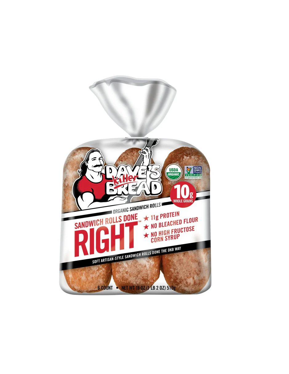 Disfruta de un pan saludable y delicioso con los panecillos blancos orgánicos de Dave’s Killer Bread. Hechos sin harina blanqueada ni jarabe de maíz de alta fructosa, contienen 5 supergranos y 10 g de granos integrales por pieza. Perfectos para hamburguesas, sándwiches o como acompañamiento. Certificados USDA orgánicos, sin OGM, sin conservadores ni ingredientes artificiales.