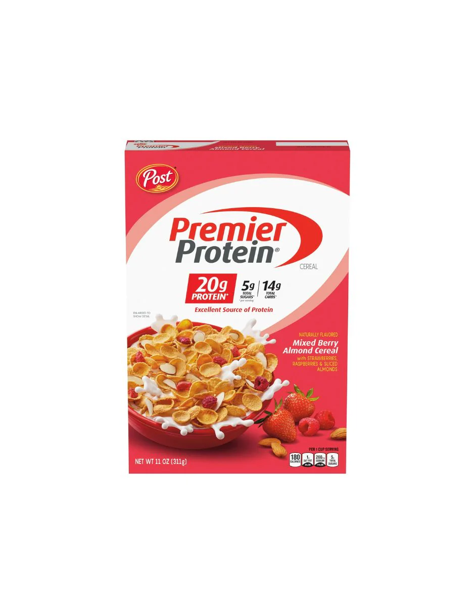 Comienza tu mañana con fuerza con el cereal de almendras y chocolate con proteína Post Premier. Cuando se sirve un plato de cereal Premier Protein con chocolate y almendras listo para comer, realmente está haciendo del desayuno la comida más importante del día. Llene sus mañanas con deliciosos copos de cereal con sabor a chocolate mezclados con almendras en rodajas reales para obtener un delicioso crujido que seguramente lo dejará satisfecho después de cada bocado. Este cereal Premier Protein contiene 5 gramos de azúcar y 20 gramos de proteína por porción, lo que lo convierte en una excelente fuente de proteína que te ayuda a sentirte lleno y listo para comenzar el día. Afronta lo que se te presente con el cereal de chocolate y almendras con proteína Post Premier. Sirve un tazón por la mañana y disfruta de este cereal proteico en el desayuno o toma un puñado como refrigerio dulce rápido para frenar los antojos nocturnos. Incluso puedes mezclar los copos de cereal proteico con sabor a chocolate con nueces y pasas para hacer una mezcla de frutos secos repleta de proteínas. Siéntete bien con el gran sabor con el cereal de chocolate y almendras con proteína Post Premier.