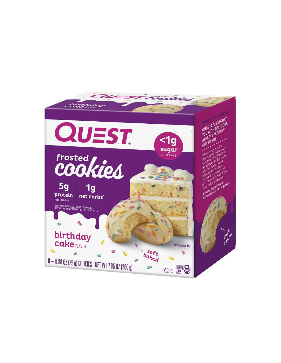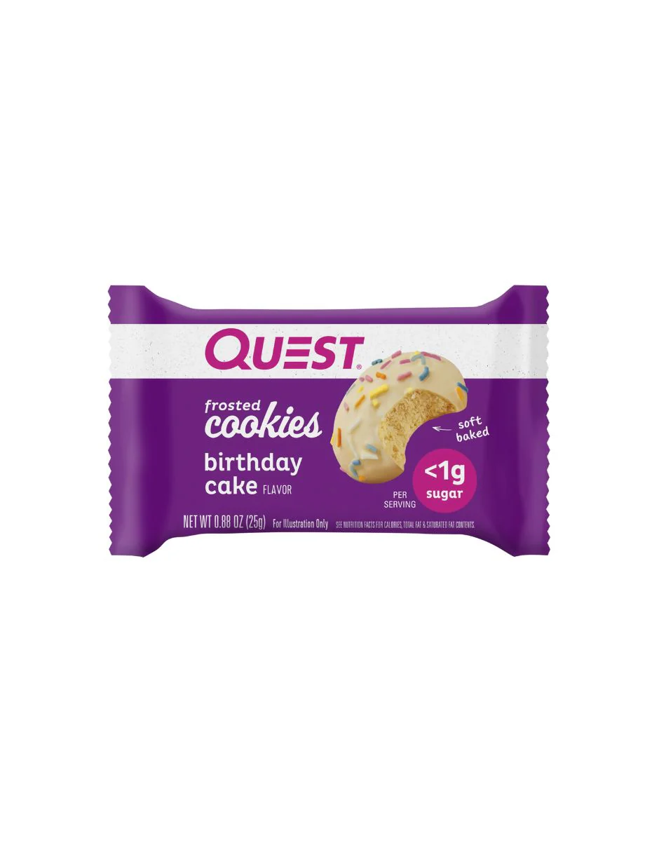 Quest Birthday Cake Frosted Cookies: galletas horneadas suaves cubiertas de chocolate. Estas golosinas del tamaño de un bocado ofrecen tanto los macros como la indulgencia que está buscando. ¡Satisfaga su gusto por lo dulce sin todo el azúcar! Quest Frosted Cookies hará que los alimentos que anhelas trabajen para ti, no en tu contra. Los productos de Quest Nutrition siempre cumplen con el uso exclusivo de proteínas completas, minimizan los carbohidratos y el azúcar y mantienen el sabor a la vanguardia.
