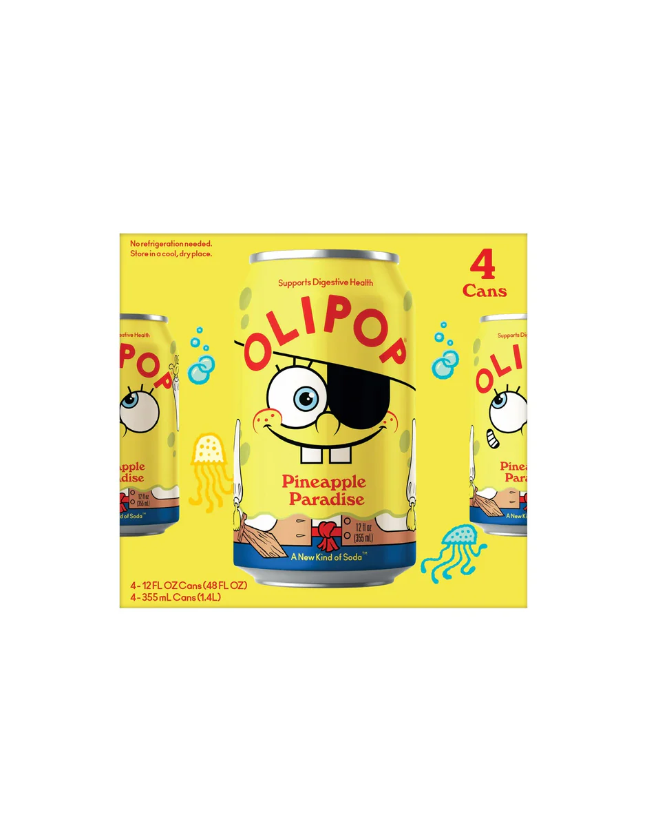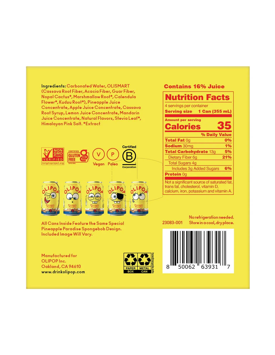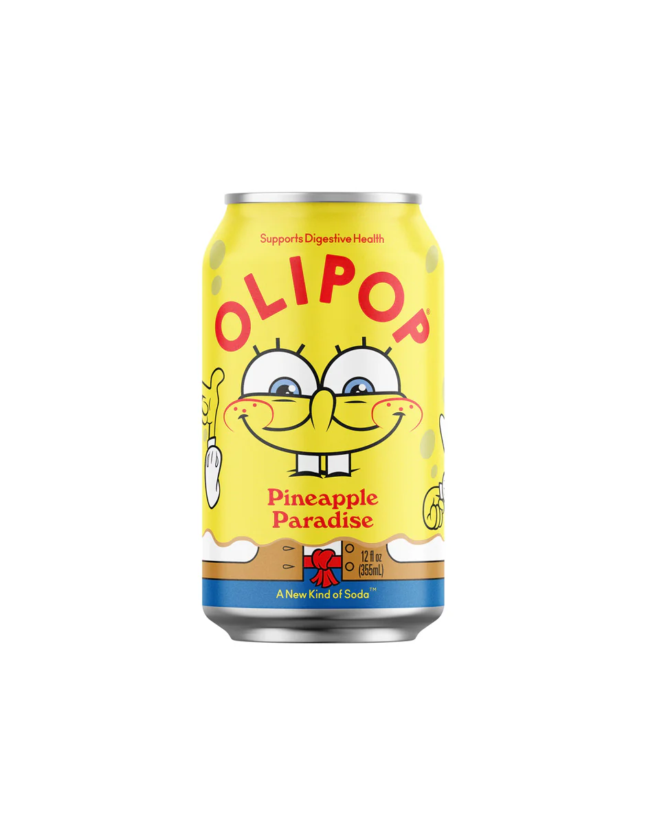 Disfruta OLIPOP Paraíso de Piña edición Bob Esponja: solo 4g de azúcar, alto en fibra y con prebióticos que apoyan tu salud digestiva.