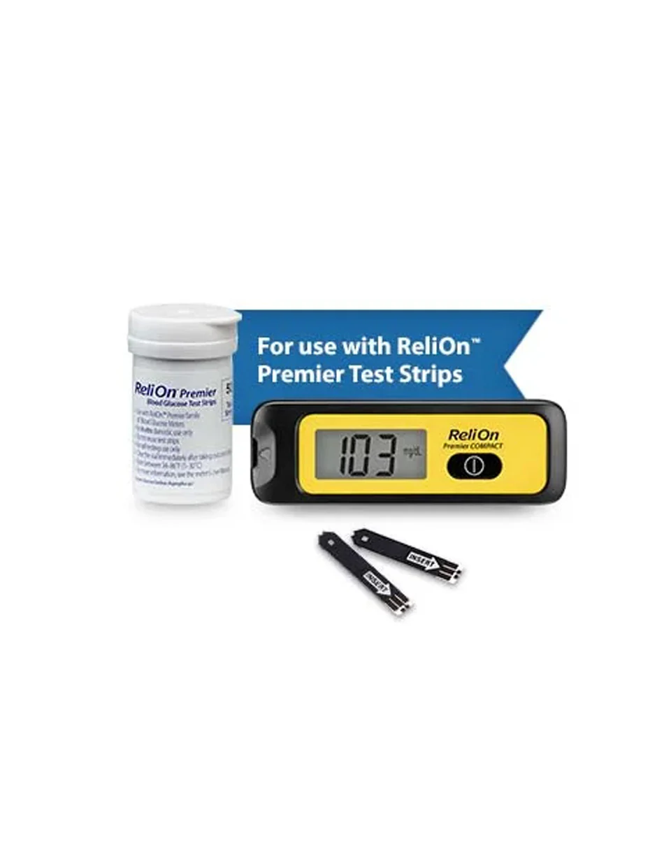 El Sistema ReliOn Premier Compact ofrece un monitoreo práctico y confiable gracias a su diseño fácil de usar y sin configuraciones iniciales. Solo inserta una tira reactiva y está listo para funcionar. Este kit completo incluye el medidor Premier Compact, un dispositivo de punción con 10 lancetas, 50 tiras reactivas, batería, registro, manual y un estuche de transporte. Permite realizar pruebas en sitios alternativos como antebrazo, palma, muslo y pantorrilla. Una opción accesible y conveniente para quienes necesitan un seguimiento diario.