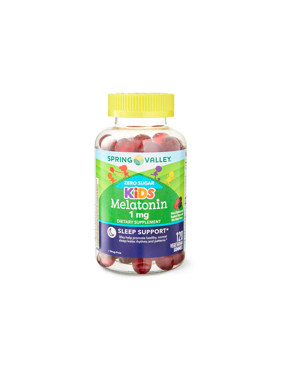 - Spring Valley Zero Sugar Kids Melatonina Sleep Support Suplemento dietético Gomitas, frambuesa y mora, 1 mg, 120 unidades