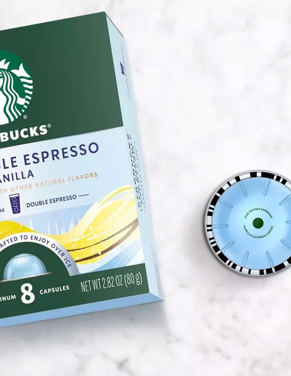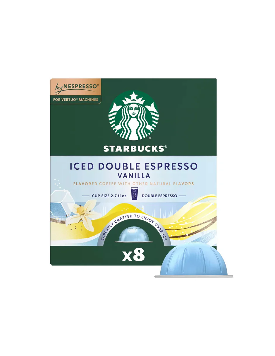 Disfruta del café Starbucks que conoces y adoras con esta caja de 8 cápsulas Starbucks Iced Double Espresso Vainilla para máquinas Nespresso Vertuo.