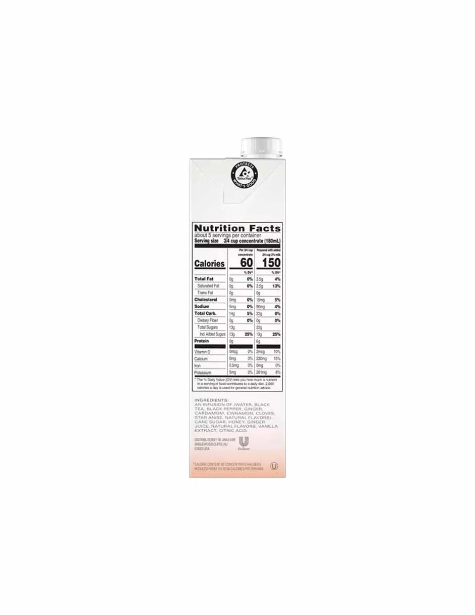 33 % menos de calorías que Chai Latte clásico*, manteniendo el sabor a Chai que tanto te gusta; *El contenido calórico del concentrado se ha reducido de 110 a 60 calorías por porción
